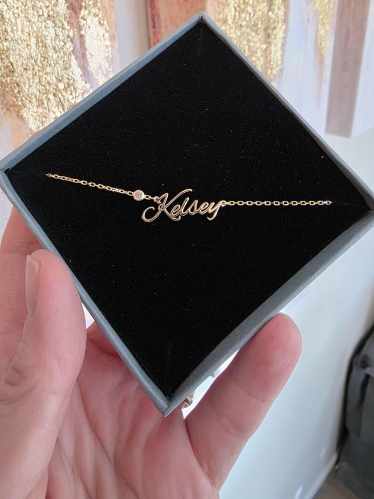 Seller helped with choosing a font and communication was prompt. Much appreciated! The necklace is so beautiful and delicate. It's font #5 with a Tourmaline birthstone. I was expecting the stone to be a darker pink- it's a very light pink color, but still very pretty. I think Kelsey will love it. Thank you!